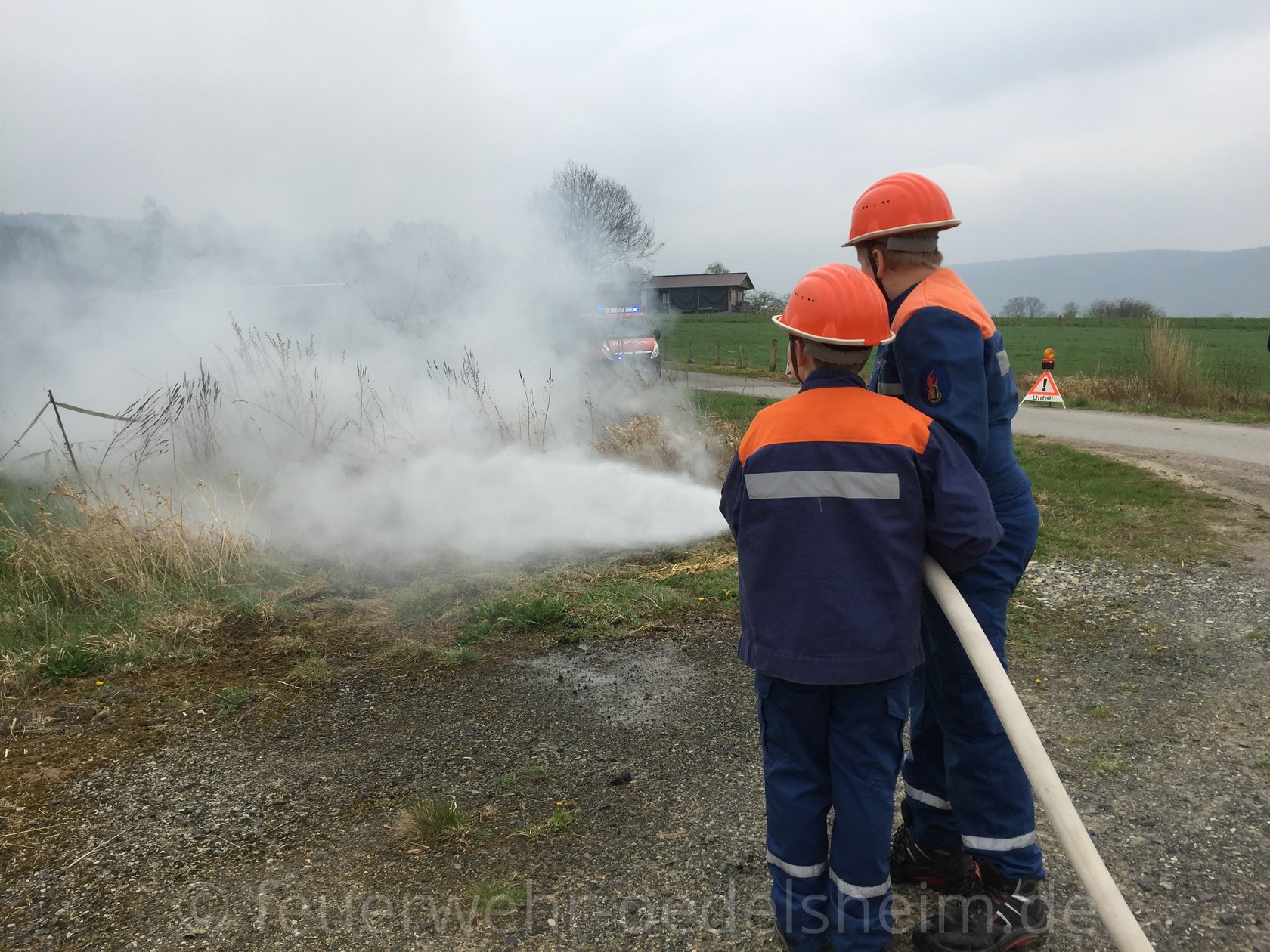 Morgens um 8:00 Uhr wurde gemeinsam gefrühstückt und sich über die Ereignisse unterhalten. Bis dann um 09:30 Uhr der Melder das letzte Mal piepte: Kleinbrand! In Sekundenschnelle saßen alle auf den Fahrzeugen und es konnte losgehen. Diesmal sogar mit echtem Feuer! Nach Aufbauen der Wasserversorgung konnte das Feuer schnell mit einem CM-Strahlrohr bekämpft werden.